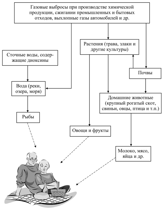 | Источник загрязнения | Механизм поступления диоксинов | Места распространения |